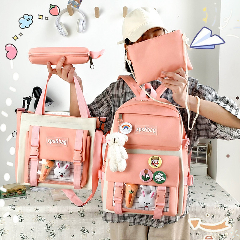 Four-Piece Student Bag Female Primary School Junior High School Student High School Backpack College Student Canvas Contrast Backpack Male Trendy